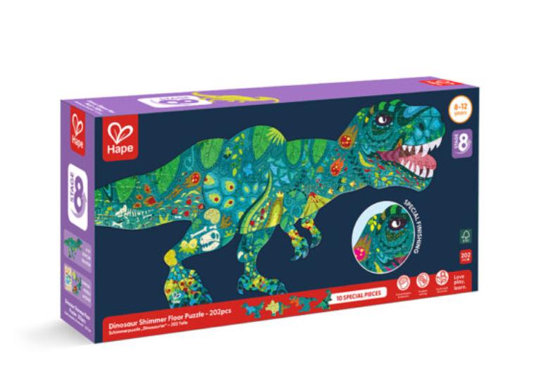 This prehistoric-themed floor puzzle challenges school-aged kids (8-12 years) with 200 pieces, including 10 special dinosaur-shaped pieces. It comes with a poster for extra learning and features a striking Tyrannosaurus rex illustration, enhancing focus, problem-solving, and curiosity about dinosaurs.