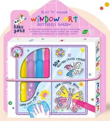 This window art set lets kids create colourful garden and jungle designs with smooth water-based beeswax markers. It includes four vibrant markers with ventilated caps and ten reusable static stickers, making it easy and mess-free to decorate windows, mirrors, paper, and more. Cleanup is easy?just wipe with a damp cloth and start again. Pink & yellow box