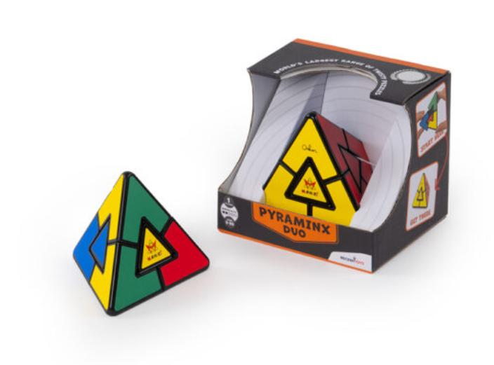 For the beginner puzzler, or the pro looking for a new challenge. With remarkably simple design, the Pyraminx Duo might seem one-dimensional. But this puzzle has a double-solution: first, solve by bringing each colour to one side; now, can you do it again?but in just four twists?